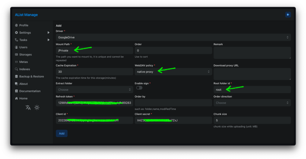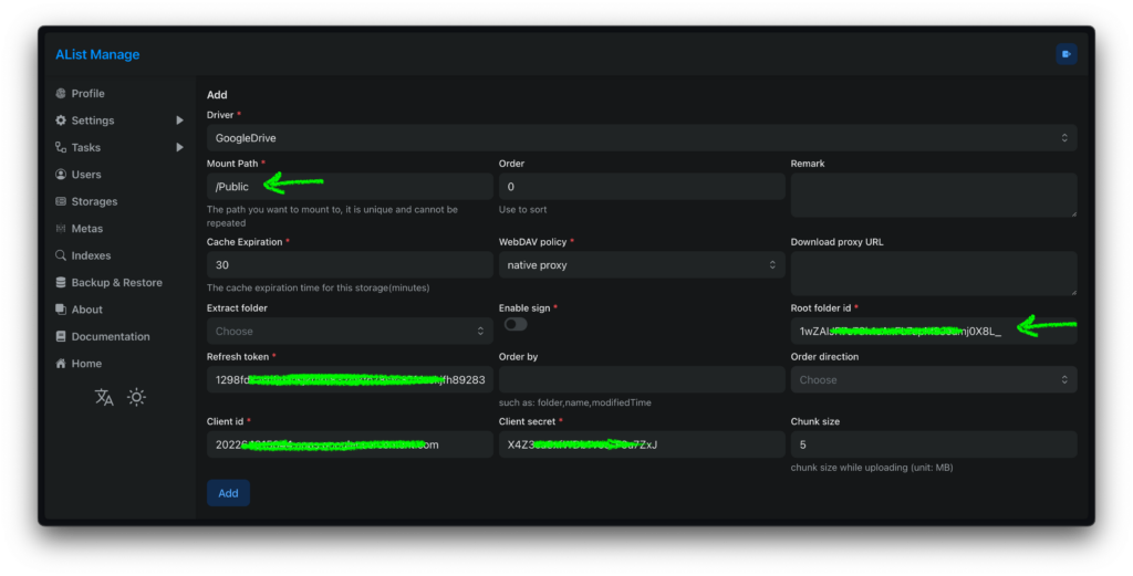 Điền giá trị này vào Root folder id bên trong AList Manage Storages