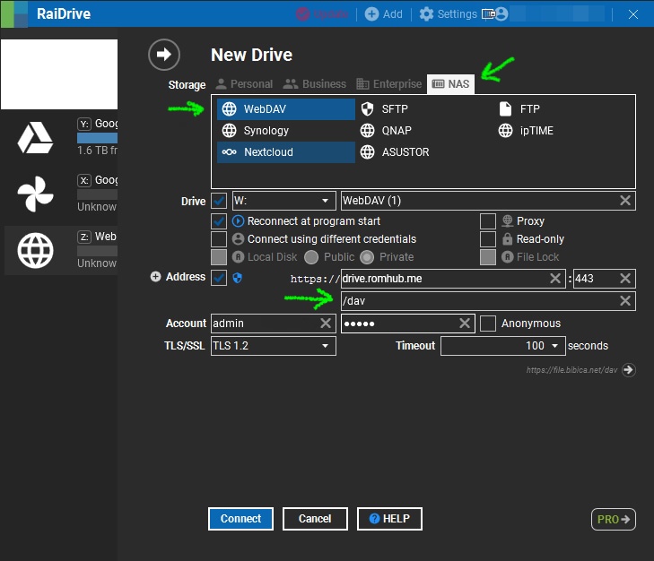 Việc cấu hình cũng rất đơn giản, điền domain với user + pass của bạn vào, thêm đường dẫn tới thư mục /dav là xong.