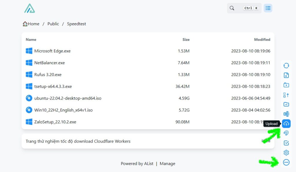 Khi bạn vào trang chủ của Alist, sẽ thấy 1 icon menu 3 dấu chấm nhỏ ở bên dưới góc phải màn hình, ấn vào sẽ thấy các icon như Upload hay tạo xóa thư mục, file …. ấn vào icon Upload để tới phần Upload