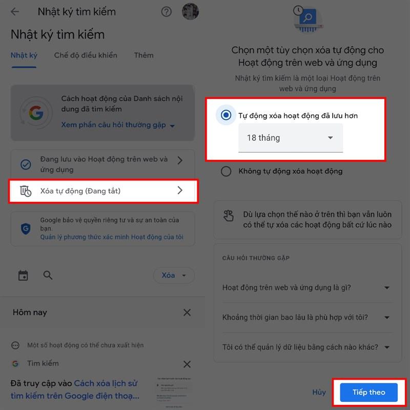Bước 2: Sau khi ấn vào đó bạn sẽ thấy một mục là Xóa tự động, chọn vào đó rồi ấn tick ở mục Tự động xóa hoạt động đã lưu hơn. Chọn thời gian lưu có thể là 3,18, hay 36 tháng tùy bạn. Sau đó ấn vào Tiếp theo và Xác nhận là xong.