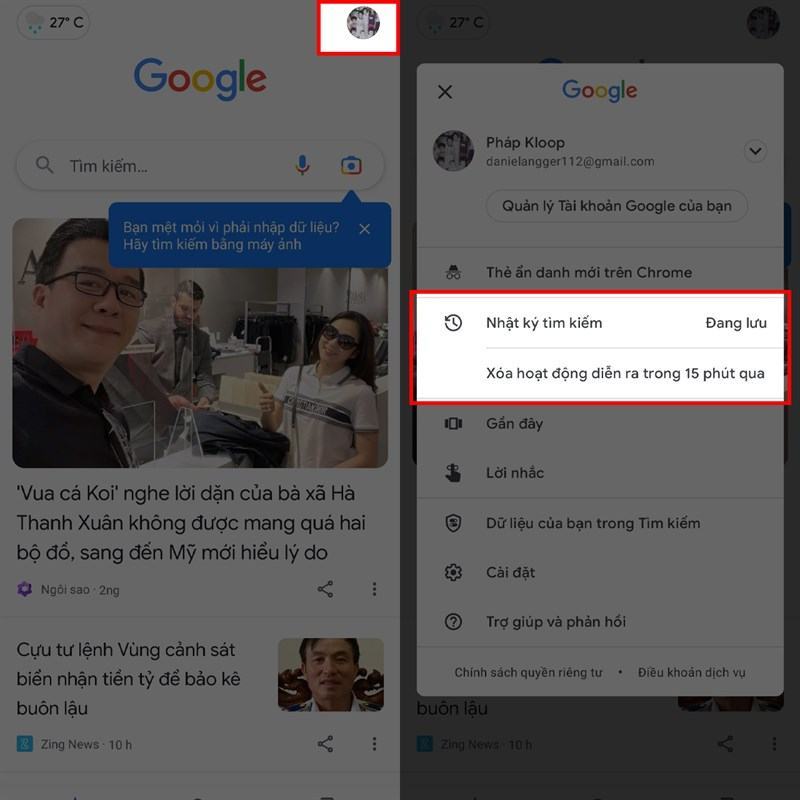 Bước 1: Vào ngay ứng dụng tìm kiếm Google trên điện thoại của mình và ấn ngay vào biểu tượng avatar ở góc trên bên trái màn hình. Chọn tiếp vào mục Nhật ký tìm kiếm.