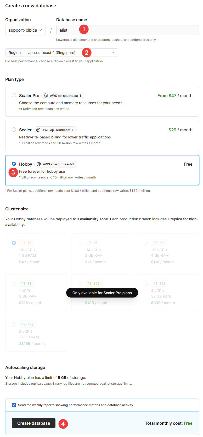 - Plan type: chọn gói miễn phí Hobby