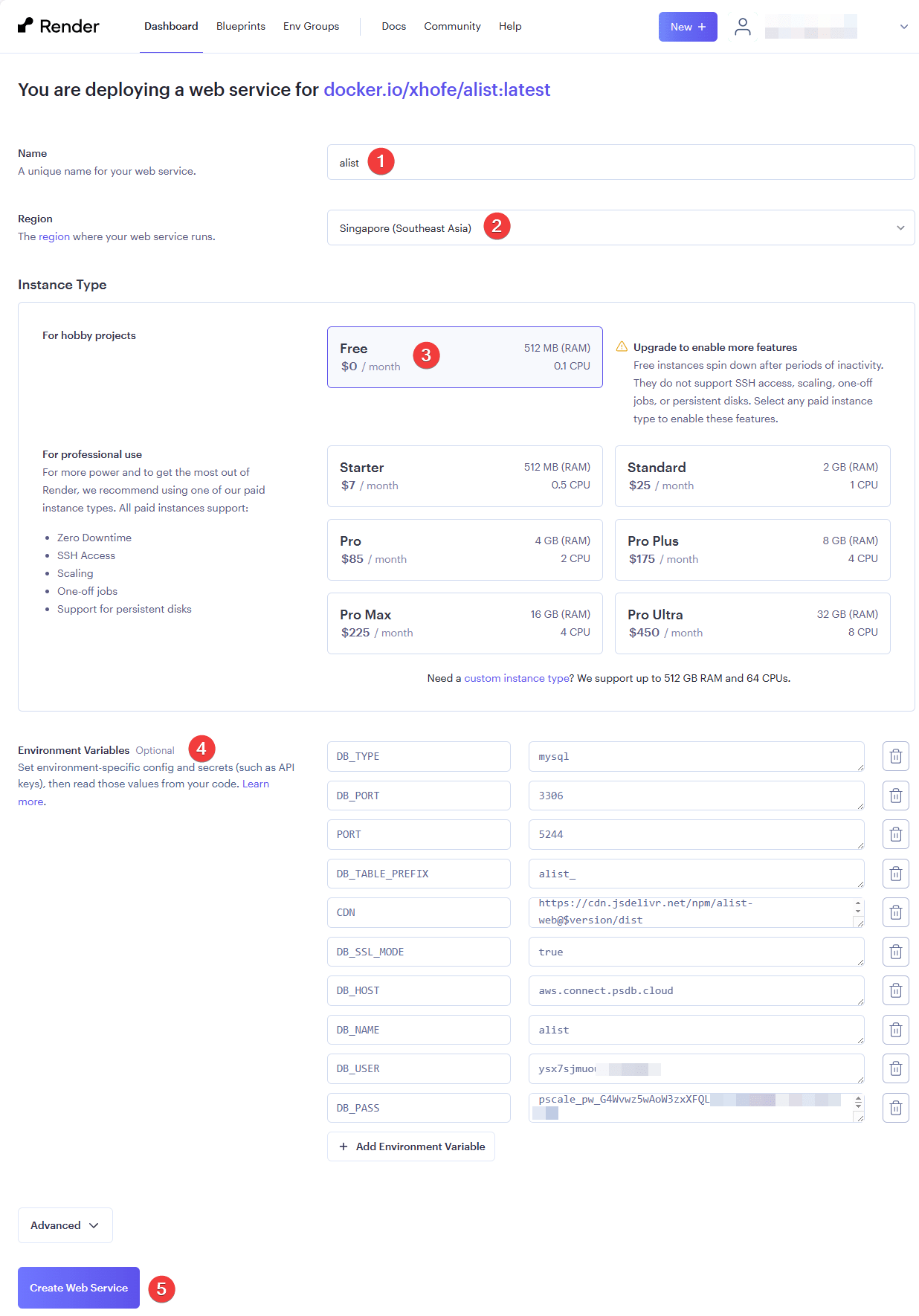 - Region: chọn Singapore cho nhanh