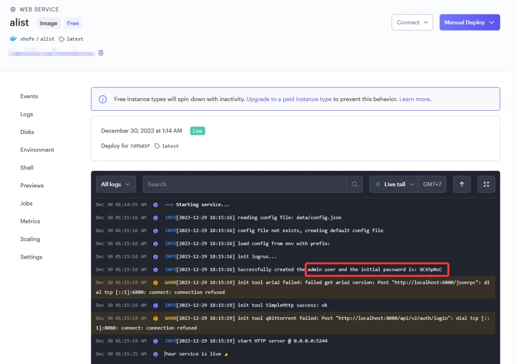 Về tổng thể lúc này chúng ta đã cài đặt thành công AList qua Render và PlanetScale