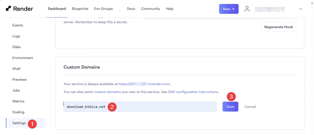 Vào tab Setting sau đó kéo xuống dưới sẽ thấy phần Custom Domains, điền vào 1 subdomain mà bạn muốn sử dụng, trỏ CNAME về theo hướng dẫn của Render