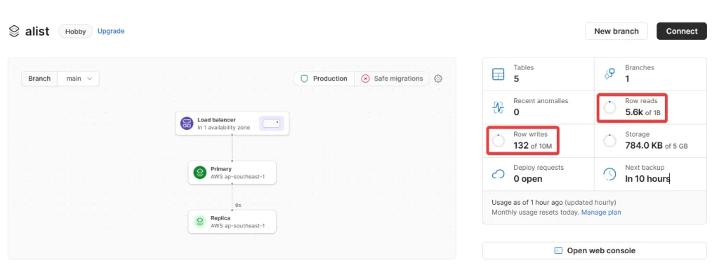Tạm mình cũng chưa rõ các con số liên quan tới đọc và ghi, PlanetScale tính toán dựa vào cái gì, ở các trang có số lượng người download đông đảo thì có đủ không? để thử nghiệm hôm qua mình có ngồi nghe Thùy Chi online trên AList, upload thêm 1 số file trực tiếp lên AList, chạy nửa buổi thì thấy các con số liên quan tới đọc và ghi như thế