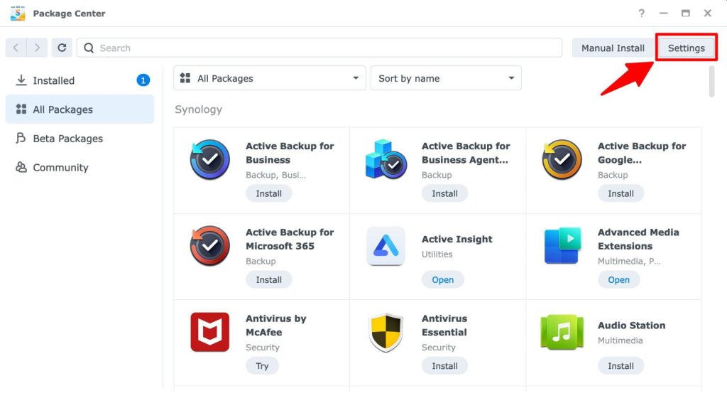 Mặc định sau khi cài đặt, DSM chỉ cho phép cài đặt các phần mềm được duyệt bởi Synology. Để cài thêm các phần mềm khác, cần phải thêm nguồn cài đặt mới (Package Source).