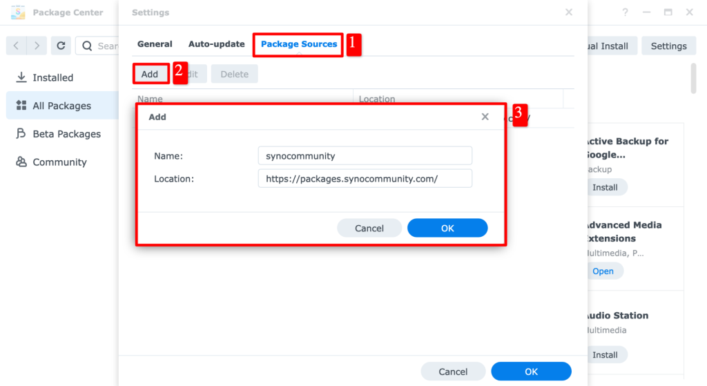 Chọn tab Package Sources, bấm vào Add và nhập https://packages.synocommunity.com/ vào mục Location. Còn Name bạn có thể gõ tên tùy ý. Bấm OK, rồi OK thêm lần nữa.