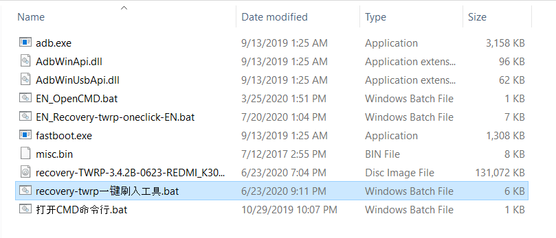 Bước 2: Mở file TWRP trong máy tính chọn dòng .bat để cài:
