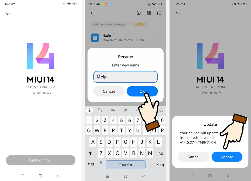 Bước 1: Sau khi tải về bản ROM, hãy mở ứng dụng File (Tệp), tìm tới thư mục chưa file vừa tải, thường sẽ là ở trong Download, nhấn giữ vào file ROM MIUI, chọn Rename (Đổi tên), đổi thành M.zip, chọn OK, sau đó làm tương tự với file ROM HyperOS, đổi thành chữ H.zip,