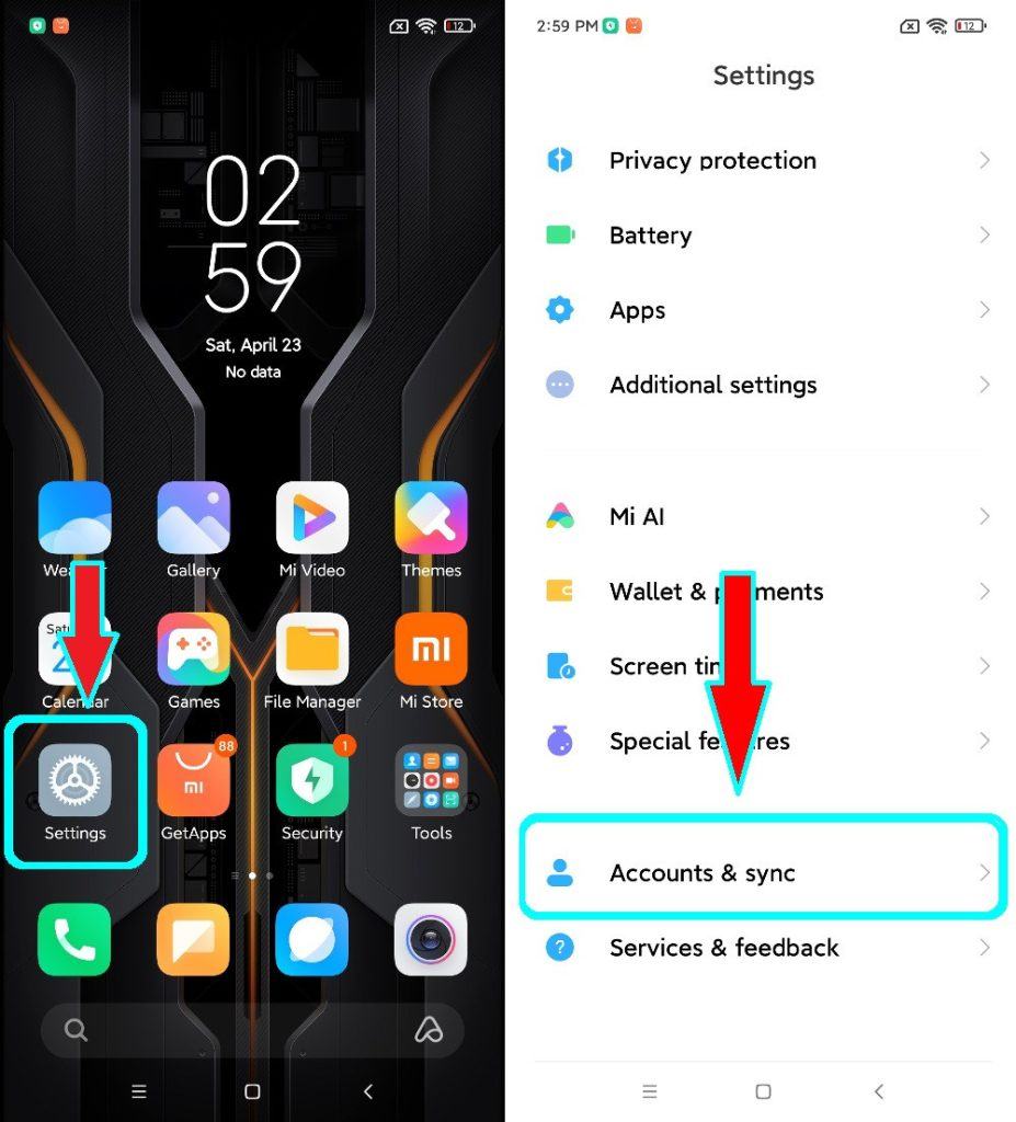 - Vào “Settings“, kéo tìm mục Accounts & sync và bấm vào.