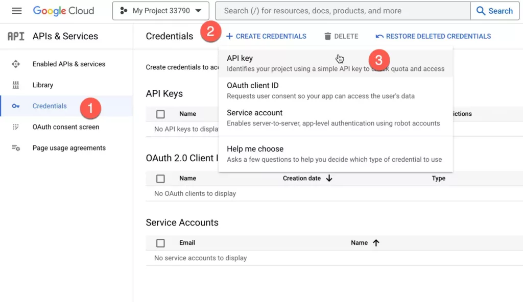Sau khi Enable thành công. Bạn tìm và bấm vào mục Credentials bên thanh menu trái, sau đó chọn Create Credentials như hình: