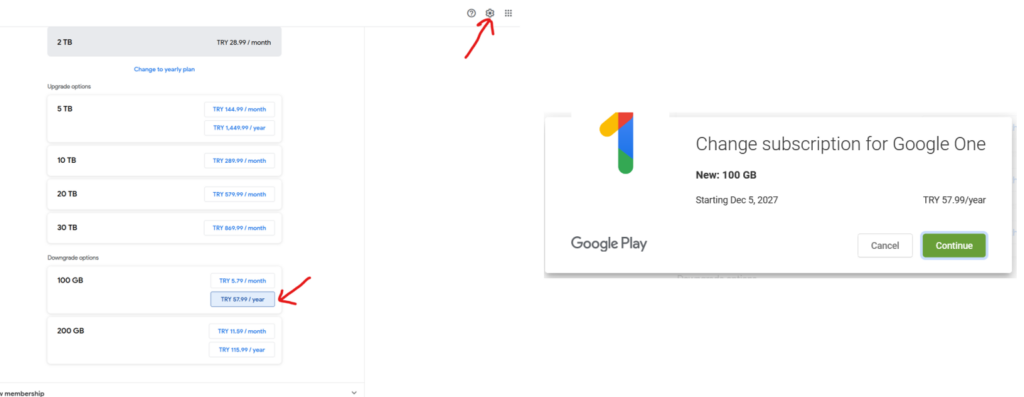 Bước 5: Truy cập one.google.com > Chọn cài đặt > Chọn Downgrade Options > chọn gói 100GB. Bạn sẽ có gói 100GB free tới năm 2027