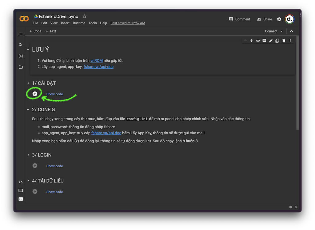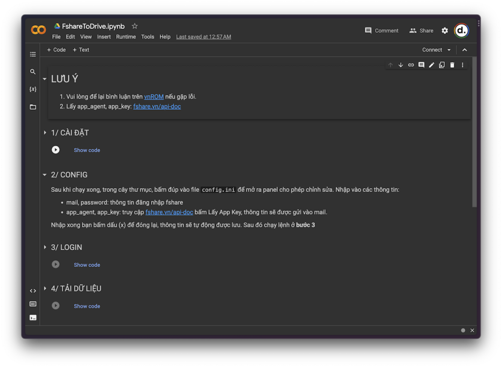 Chúng ta sẽ sử dụng Colab, vì Colab thông với Google Drive, dữ liệu về đó thì sẽ về Drive trong nốt nhạc. Mình đã tạo sẵn một sổ tay trên Google Colab, ae truy cập vào đây nhé: romhub.me/fsharetodrive