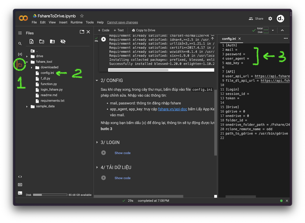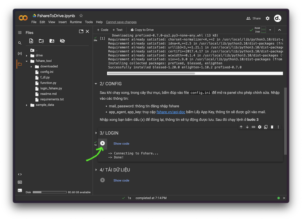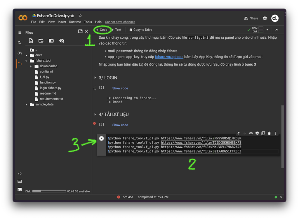 Ở đây mình dùng tool của bạn lvdat trên Github, mình có chỉnh lại code một chút xíu để phù hợp với Google Colab. Tốc độ tải Fshare vào khoảng 10 MiB/s (do sever Colab ở Mỹ), không phụ thuộc vào tốc độ mạng máy tính của bạn.