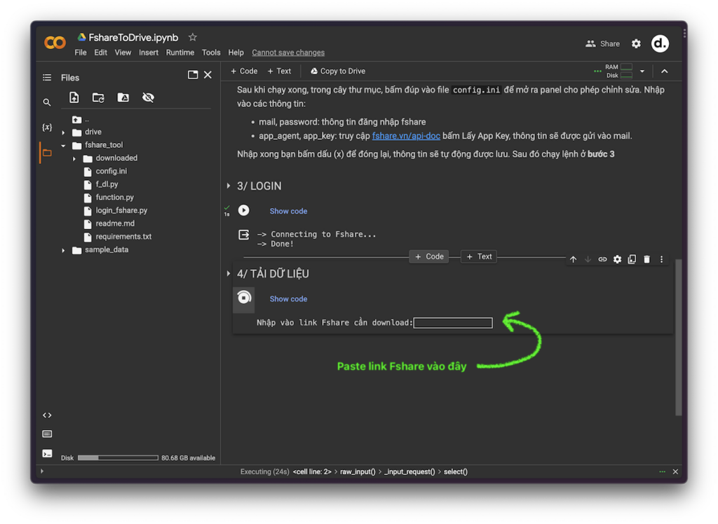 Chạy code ở bước 4 và paste link fshare cần tải vào rồi Enter là tool sẽ tự động tải.