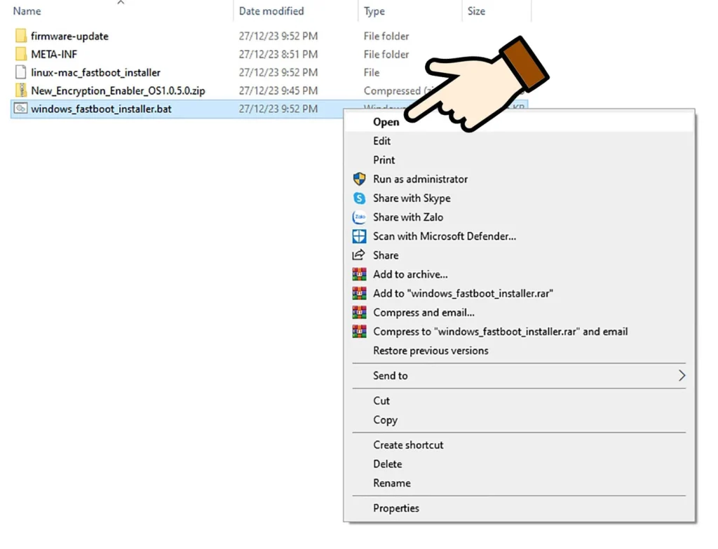 Bước 3: Trên điện thoại, tắt nguồn, sau đó bấm giữ cùng lúc phím nguồn và giảm âm lượng, tới khi màn hình hiện chữ Fastboot thì bỏ cả hai phím cứng ra. Dùng cáp sạc kết nối điện thoại với máy tính. Bước 4: Mở thư mục EliteRomLite_FUXI_OS1.0.7.0_ChinaStable_os1-A14-HYBRID, click chuột phải vào file có tên windows_fastboot_installer.bat, sau đó chọn Open để chạy file.