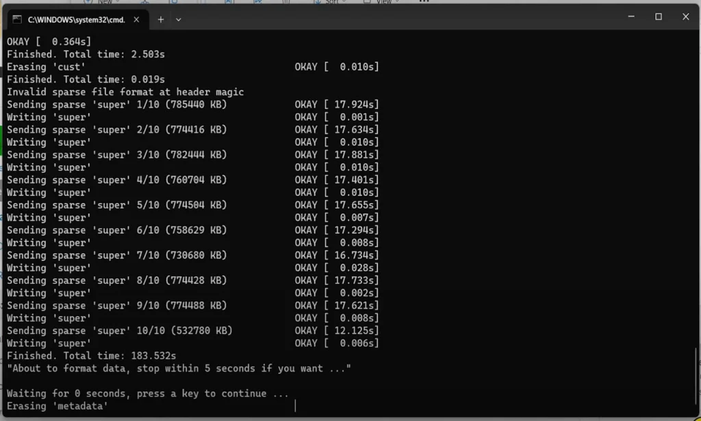 Khi quá trình cài ROM hoàn tất máy tính sẽ thông báo như hình phía dưới, và trong 5 giây sẽ tự đóng cửa sổ cmd màu đen, khi này điện thoại của bạn sẽ tự động khởi động lại. Lần khởi động đầu tiên sau cài ROM sẽ khá lâu, bạn nên đợi.