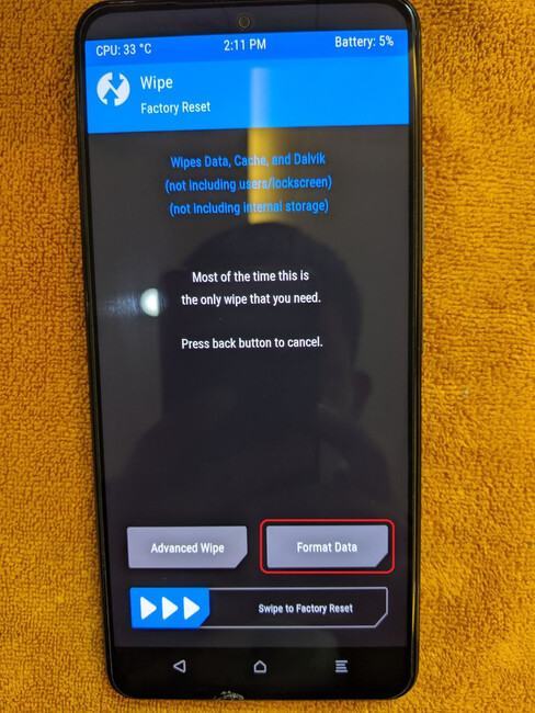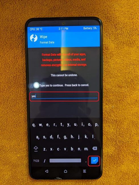 Bước 4: Trên điện thoại chọn Wipe > Format Data, sau đó gõ “yes” rồi nhấn dấu tích xanh để điện thoại format.