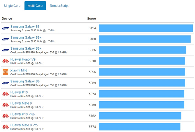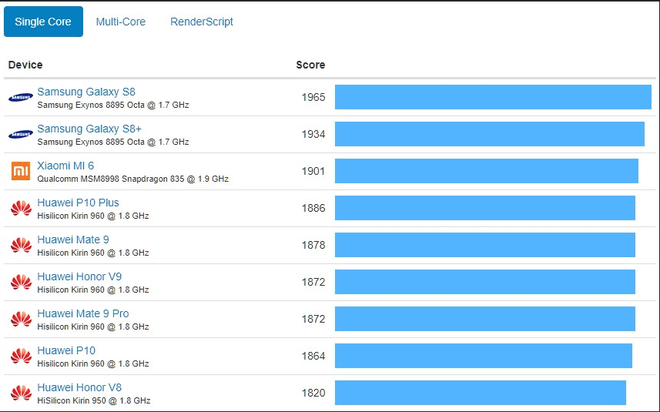 Những vị trí top đầu bảng xếp hạng của Geekbench, tính cả Android lẫn iOS, đều sử dụng bộ xử lý được xây dựng trên tiến trình 10nm – Android có cặp đôi Snapdragon 835 và Exynos 8895, còn A11 Bionic đã vượt lên trên tất cả ngay lần đầu tiên chạy thử bài benchmark.