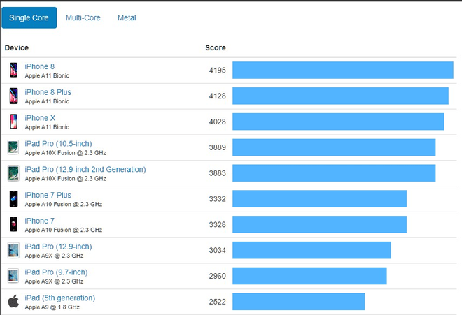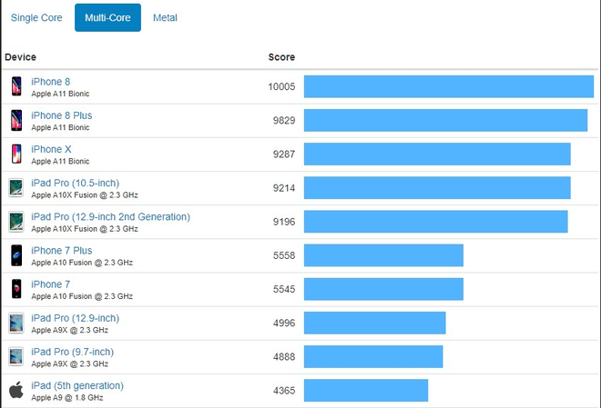 Kể từ khi kết quả bài benchmark đầu tiên của vi xử lý Apple A11 Bionic bị rò rỉ, ta đã biết rằng nó sẽ là một “con quái vật cấu hình”, thế nhưng cũng chẳng ai có thể ngờ được rằng iPhone 8 và iPhone X lại có điểm Geekbench cao gấp đôi những flagship Android đầu bảng như Galaxy S8/S8+ hay Galaxy Note 8.