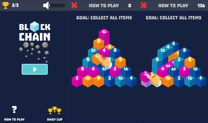 Nhiệm vụ của bạn trong Blocks Chain là sắp xếp các khối cùng màu và số với nhau để nhận được giá trị gấp đôi, trò chơi sẽ kết thúc khi chỉ còn bốn khối hộp với các màu đỏ, xanh, nâu và xanh lá cây.