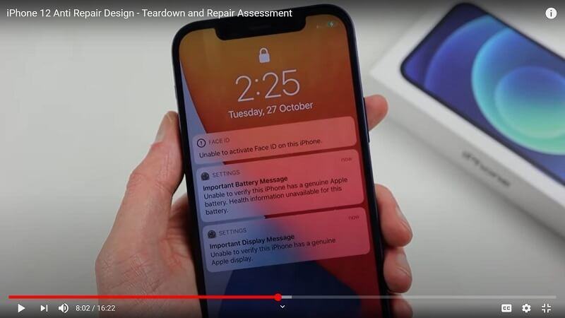 Vào ngày 28/10/2020 (giờ Việt Nam), Youtuber Hugh Jeffereys đã làm một vlog tháo 2 chiếc IP12, đổi linh kiện của chúng cho nhau để kiểm chứng lời đồn Apple sẽ ngăn chặn hoàn toàn việc sửa chữa thiết bị của bên thứ 3. Tức là nếu thiết bị của bạn cần sửa chữa, thì bạn sẽ phải ra Apple Store để sửa với một cái giá khá “hời” hoặc vứt xó (chưa thể khẳng định được).