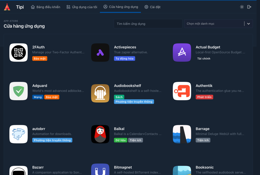 Tipi được tích hợp thư viện App Store với rất nhiều các ứng dụng có sẵn. Các ứng dụng này đều được cài đặt thông qua docker compose, nên bạn có thể cài đặt hay xóa bỏ nhanh chóng mà không gây ảnh hưởng đến hệ thống.