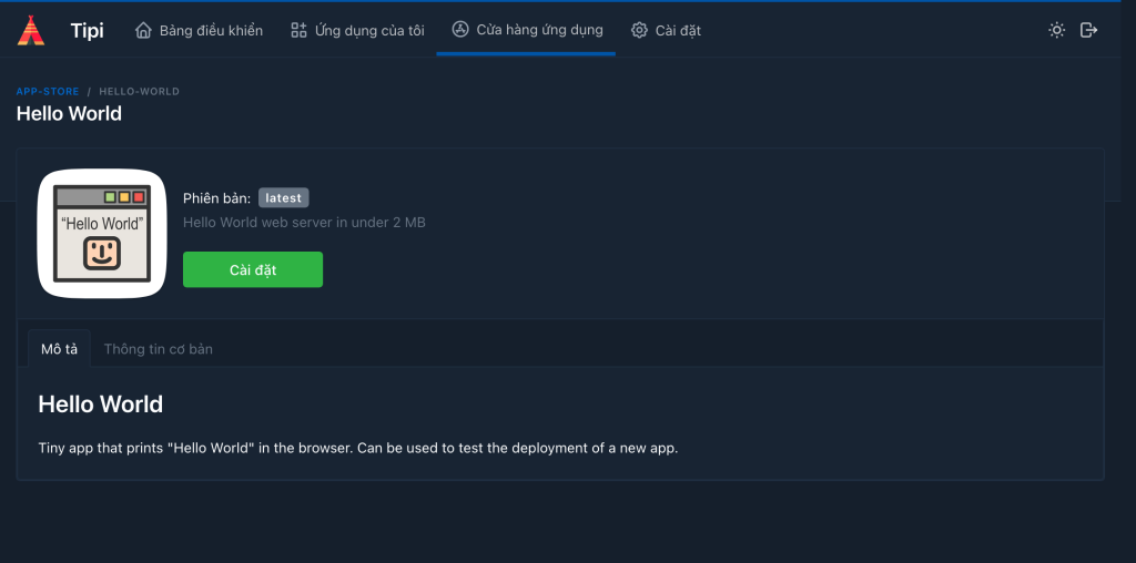 Mình chọn cài đặt thử 1 ứng dụng mini có tên Hello World để làm demo. Bấm vào tên ứng dụng, sau đó bấm Cài đặt