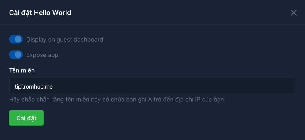Chọn Display on guest dashboard để hiển thị ứng dụng ra trang Ứng dụng của tôi. Chọn thêm Expose app để cấu hình tên miền cho ứng dụng. Tipi sẽ tự động xác thực tạo chứng chỉ Let’s Encrypt SSL cho tên miền này.
