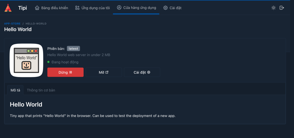 Sau khi cài đặt xong, mình có thể bấm vào nút Dừng để tạm ngưng ứng dụng, hoặc bấm vào nút Mở để truy cập ứng dụng thông qua IP:Port hoặc tên miền.