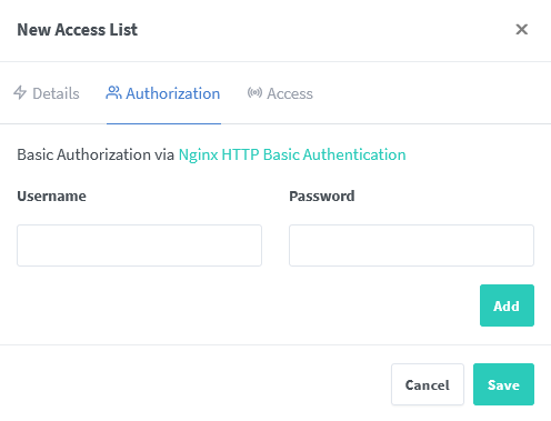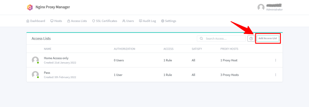 Truy cập vào Nginx Proxy Manager, chọn vào mục Access Lists trên Menu Bar, bấm vào Add Access List