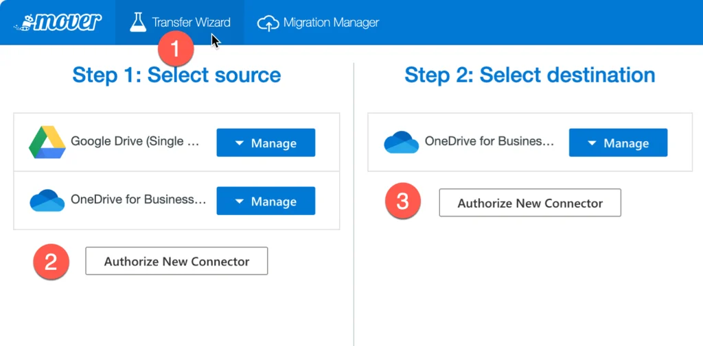 Tiếp theo công việc khá đơn giản, bấm Transfer Wizard > Bấm Authorize New Connector để kết nối với cloud nguồn và cloud đích > Cuối cùng bấm Start Copy để bắt đầu quá trình chuyển dữ liệu.